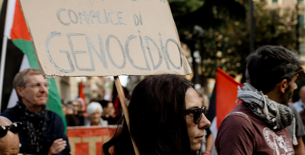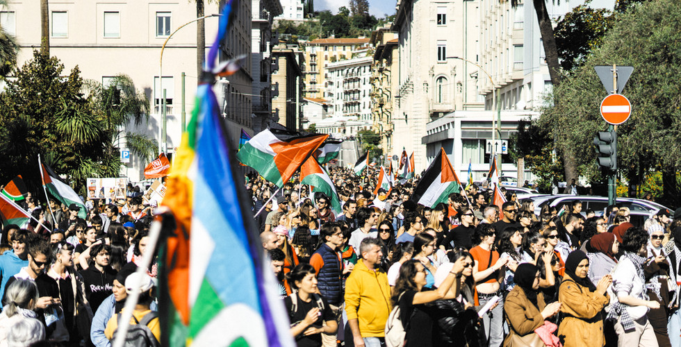 Cori, abbracci, baci, megafoni. La gente lungo il marciapiede osserva la sfilata per Gaza. I turisti di passaggio ci guardano e qualcuno applaude pure. C’è chi, seduto al bar a fare colazione, posa il cappuccino, prende il telefono, fa una storia su Instagram o Tiktok e poi dà un morso alla brioche.