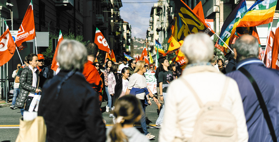 Un fiume di gente attraversa la città. Mezzo chilometro di persone per strada in marcia verso piazza Verdi e poi viale Italia. Il corteo è così composto: in testa i veterani della CGIL, a seguire i ragazzi di Riconvertiamo Seafuture e poi il corteo studentesco.
